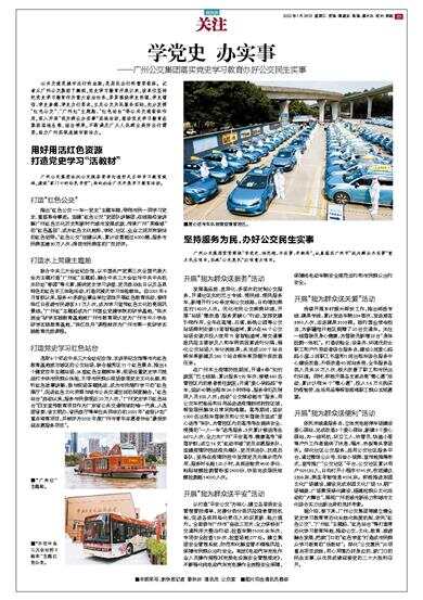 ——广州公交集团落实党史学习教育办好公交民生实事 公共交通是城市运行的血脉,是居民出行的重要载体。记者从广州公交集团了解到,党史学习教育开展以来,该单位坚持把党史学习教育作为重大政治任务,