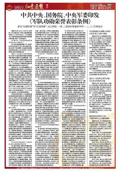中共中央、国务院、中央军委印发《军队功勋荣誉表彰条例》