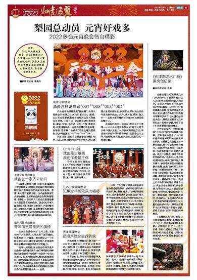 2022多台元宵晚会各自精彩 日前,2022年央视元宵晚会、央视《那年元夕今宵情——2022年元宵戏曲晚会》以及各大卫视的元宵晚会正在录制或已录制完成,各台晚会看点多多。 ■新快报记