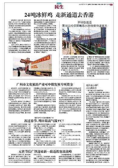 新快报讯 记者王娟 通讯员关悦报道 2月16日下午,广东温氏佳润食品有限公司的24吨冰鲜鸡成为通过“新通道”运往香港的首批生鲜货物(见下图,通讯员供图)。 广东是内地输港食品(含鲜活农产品