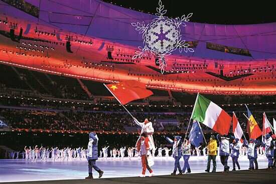 ■20日晚,北京第二十四届冬季奥林匹克运动会闭幕式在国家体育场举行。两位冬奥会冠军高亭宇和徐梦桃在闭幕式上担任中国代表团旗手。新华社发