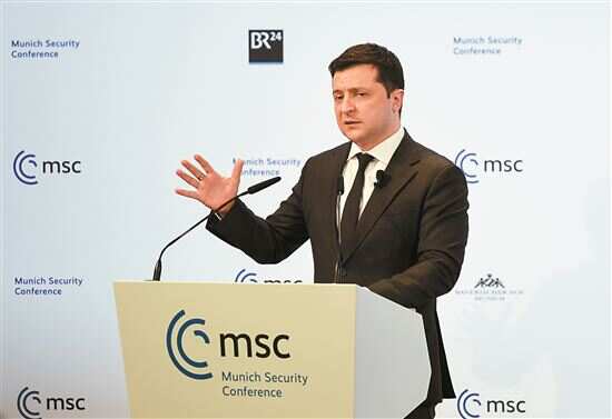 ■2月19日,在德国慕尼黑,乌克兰总统泽连斯基在第58届慕尼黑安全会议(慕安会)上发言。 新华社发 |