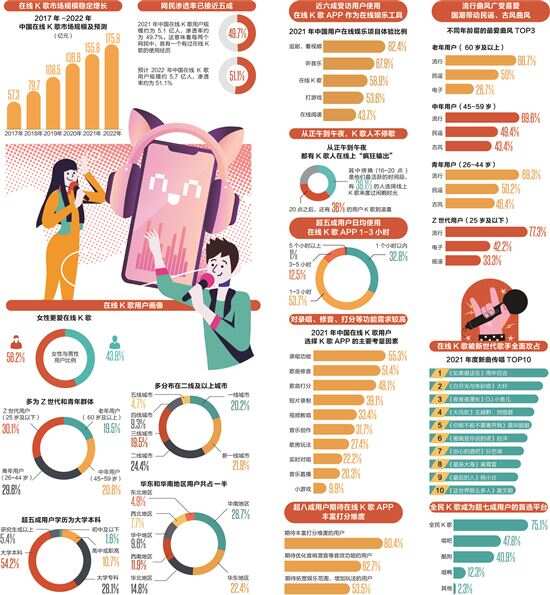 在线K歌百亿市场蓬勃发展 ■策划:罗韵 ■统筹:梁彧 ■采写:新快报记者 梁茹欣 ■制图:廖木兴 曾几何时,“吃饭+K歌”是春节聚会的标配。人们习惯在觥筹交错之后,约几个亲朋好友到KTV一展歌喉。随着娱乐方式的多元化,再加上疫情反复的影响,KTV不再是其中首选,更多的年轻人开始投向在线k歌平台。 事实上,在线k歌平台并非只是线下KTV的“简化版”。除了同样具备传统的唱歌工具属性,年轻人正在将在线k歌平台当作新的“情绪树洞”,为它叠加了更多的情感交流与社交娱乐属性。目前在线k歌已经成为了在线泛娱乐领域的主要项目之一。艾媒咨询数据显示,预计2022年,中国在线K歌市场规模将达到175.8亿元,用户规模将达到5.7亿人。 用户规模持续扩张 网民渗透率已接近五成 在过去的一年里,元宇宙、NFT等虚拟数字技术概念炙手可热。这背后均指向一种新趋势:越来越多的人习惯通过互联网获取一切,包括社交娱乐、情感交流等。疫情反复更是进一步加剧了人们对线上服务的依赖,这在互联网原住民的年轻人身上表现得尤为明显。在“一切线上化”的趋势下,曾经辉煌的KTV行业也难免走向式微。 当下的年轻人正在远离KTV,一组数据对比成为了这一趋势的佐证。《中国音乐产业发展总报告》指出,仅2016年一年时间,传统KTV的数量就出现断崖式下跌,减少了近60%。2020年,受疫情等因素叠加影响,KTV行业整体客流量下降了70%-80%。截至2021年3月,曾经行业巅峰时期的12万家KTV相关企业只剩下了6.4万家,数量接近腰斩。另据前瞻产业研究院发布的《2021年KTV行业发展蓝皮书》数据显示,2021年上半年,全国量贩式KTV中,18至21岁年龄段的用户数同比下降13.4%,消费额同比下降15.4%。而60-70岁年龄段的用户数同比增长29.6%,订单量同比增长24.1%。70-80岁年龄段的用户数、订单量同比增速则高达100%左右。 与此同时,在线K歌具有较强的沉浸感体验,多元的玩法迎合了不同用户群体的个性化需求。目前已经成为了在线泛娱乐领域的主要项目之一。艾媒咨询数据显示,2021年中国在线K歌用户规模约为5.1亿人,渗透率约为49.7%。这意味着每两个网民中,就有一个有过在线K歌的使用经历。预计2022年中国在线K歌用户规模约5.7亿人,渗透率约为51.1%。 在这超5亿人的用户规模中,Z世代和青年人是主力群体。各种在线K歌平台让社交突破屏幕限制,一跃成为不少人日常生活的主要娱乐工具之一:他们习惯通过一展歌喉的方式宣泄情绪,又敢于在各种娱乐社区表达与展现自我。从正午到午夜,K歌人一直都保持较强的唱歌热情和活跃度。其中傍晚(16-20点)是他们最活跃的时间段,有38.1%的人选择线上K歌来度过闲暇时光。20点之后,还有36%的用户K歌到凌晨。