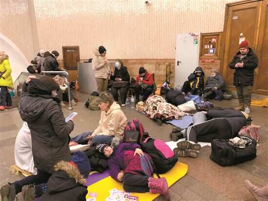 ■25日,在乌克兰基辅一处地铁站内,不少民众把这里当成防空洞一样在避险。新华社发
