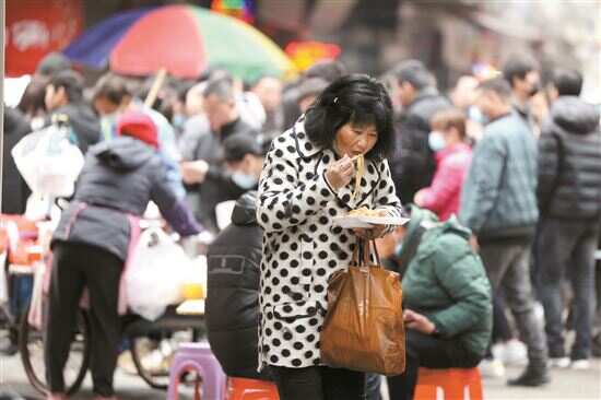 ▲上班路上,王女士抓紧时间在路边吃了一份早餐。前一天她就是在身后这条街上找到新的制衣厂干活,一个月5500元,包吃住,她觉得挺满意。 |