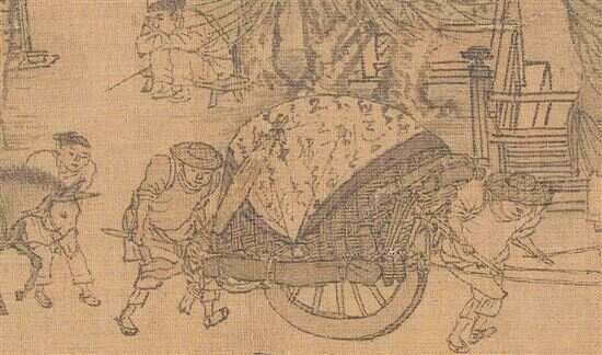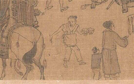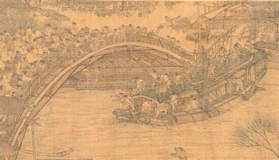 ▲拱桥是画中矛盾的高潮,充分表现了画家对事物的观察力、表现力和概括力。大船的桅杆要撞上桥帮了,怎么会发生这样的险情呢?有一个船夫非常机警,他拿起一根长篙,死死顶住桥帮,让船暂时过不去,让船工有足够时间把桅杆放下来。 (引自余辉《了不起的中国画》) |