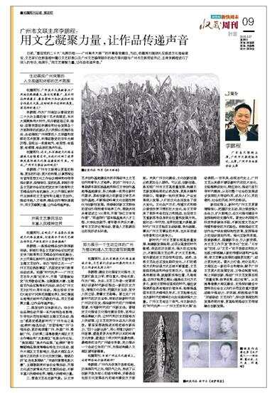 广州市文联主席李鹏程: ■收藏周刊记者 梁志钦 日前,“喜迎党的二十大‘光辉历程——广州美术大展’”的开幕备受瞩目,为此,收藏周刊围绕扎实推进文化强省建设、文艺家们在新里程中履行文艺