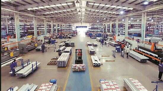 ■江河幕墙铝型材仓库内,工人正在有序搬运铝型材。 |