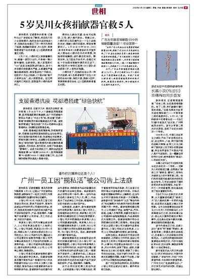 新快报讯 记者黎秋玲报道 记者昨日从广东省红会了解到,来自吴川的小女孩杨柳丹,她的生命永远定格在5岁,但她的生命通过了另一种方式得到了延续,她捐献的器官,为3名肝、肾衰竭患者留下生的希望,让2名