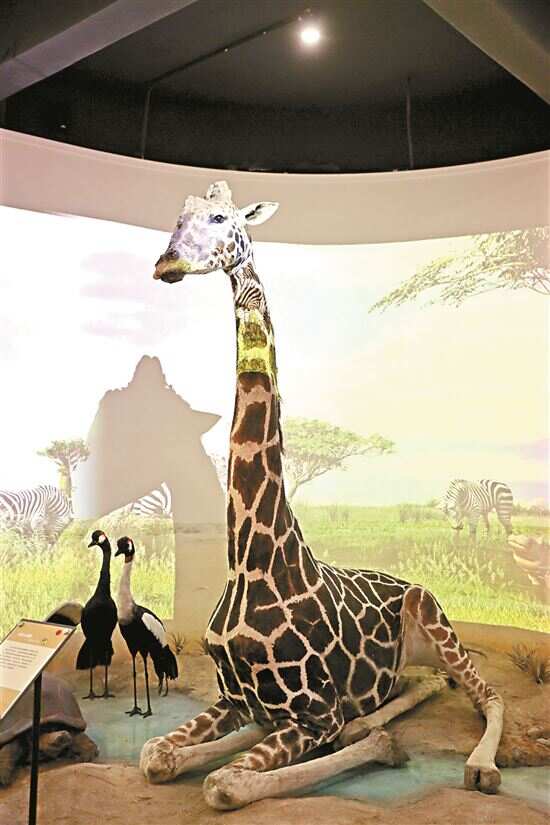 ■长颈鹿阿朗的标本,暂时摆放在广州动物园科普长廊生命的地图展馆内。 |