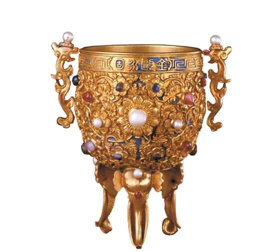 ▲金瓯永固杯,故宫藏。一面中部錾篆书“金瓯永固”,一面錾“乾隆年制”四字款。是皇帝专用的酒杯。 |
