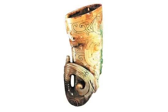 ■角形玉杯,西汉南越文王墓出土,器表上面线刻一尖嘴兽,回环往复。南越王博物院供图 |