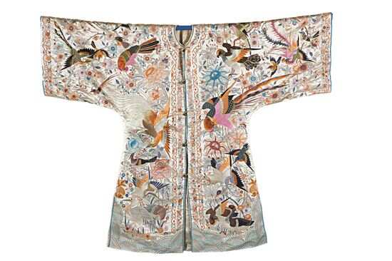 ■民国 白缎地广绣百鸟纹对襟长氅衣 |