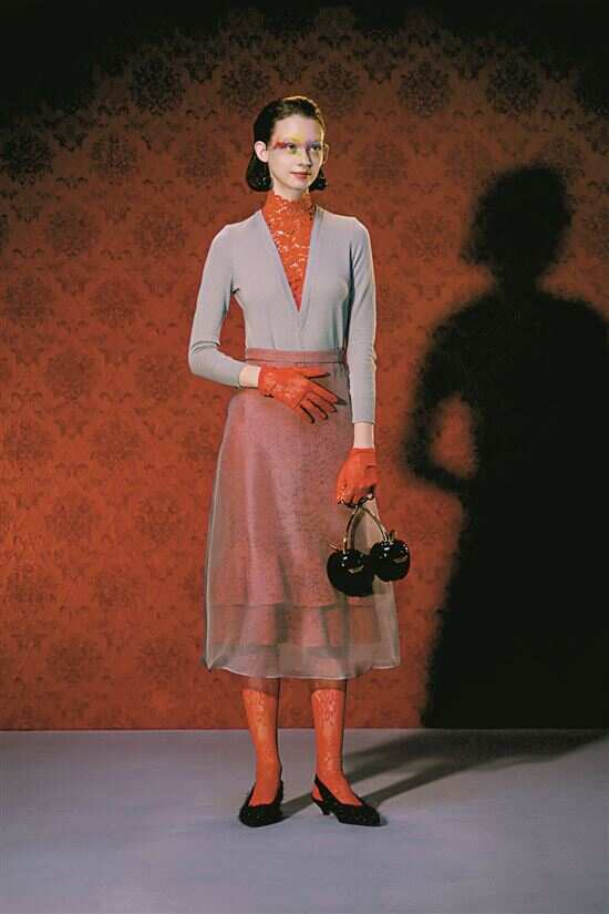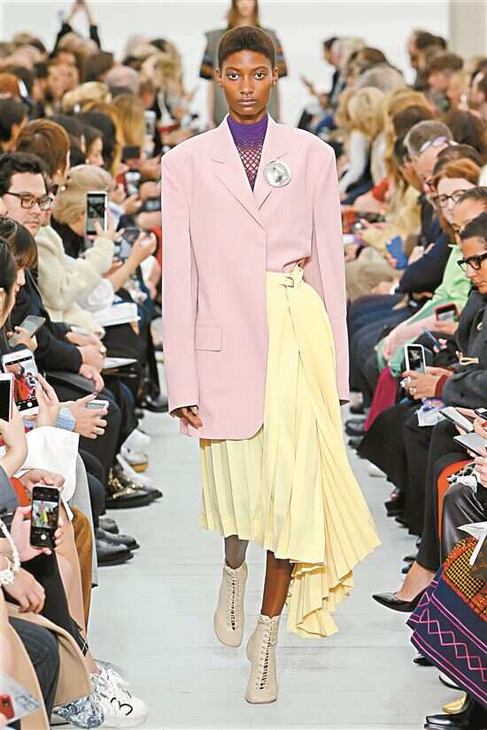▶薄纱叠搭在对比色、印花和图案外的单品正流行,通过薄纱与彩色西装相搭配,让廓形感强烈的西装增添柔软触感和层次感。 |