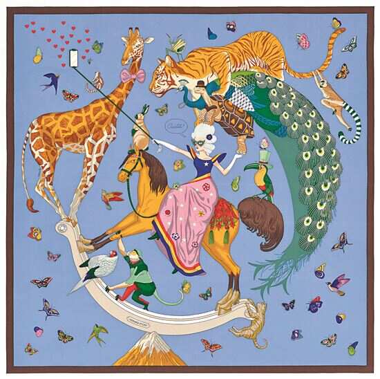 ◀斜纹真丝“爱马仕的动态分享”90厘米方巾,别样捕捉社交媒体时代的自拍画面。 |