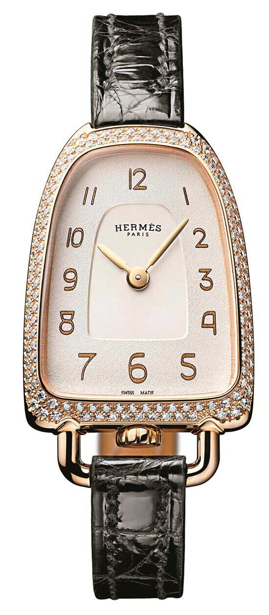 ▶Galop d’Hermes珠宝腕表以启发自马镫的曲线演绎爱马仕的马术符码,数字8的倒置马镫设计向马术世界致敬。 |