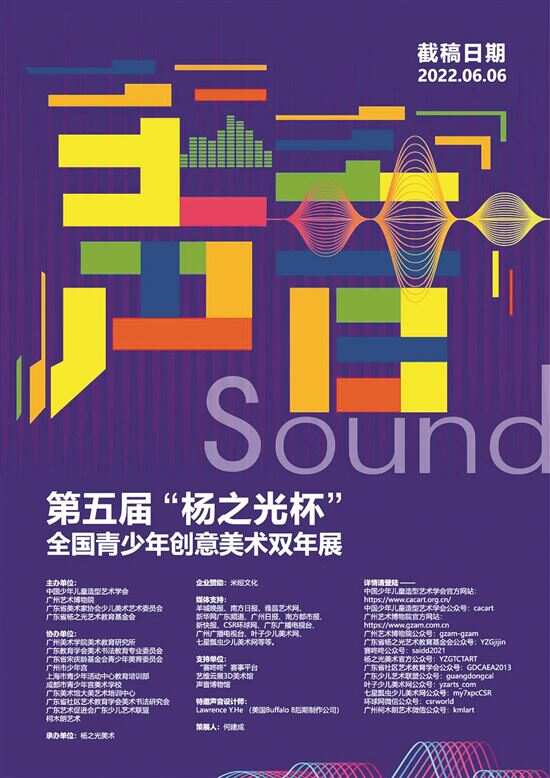 由“中国美术奖·终身成就奖”获得者、著名画家和教育家杨之光教授发起的“杨之光杯”全国青少年创意美术大型公益性活动(以下简称“活动”),倡导“创意教育从孩子抓起,中国创造从这里点燃”,以艺术的形式与手段促进中国青少年的创新能力开发。活动自2012年创办以来已成功举办四届,得到了广东省美术家协会和中国美术家协会少儿美术艺委会等单位以及全国广大美育工作者的大力支持,以公益活动与学术课题研究相结合的形式,吸引了每一届数以万计的全国师生参与。 从2020年始“杨之光杯”升级为以双年展的形式每两年举办一次。继前四届活动分别确定主题为“低碳环保生活”“时间”“温度”及“非遗所思”之后,第五届“杨之光杯”双年展主题确定为“声音”,并于2022年2月底启动,面向全国征稿。双年展将于2022年8月上旬在广州艺术博物院展出。 “声音”作为一种触摸不到的物象,其实也可以是一种心象或一种意识,所谓“心声”也由此而来。因此,“声音”是可通过图像、影像、物像与行为等等很多方式和载体来呈现的,从抽象到具象,从意识到形态。本届双年展一如既往地选择更接近科学、哲学或文学定义的命题,希望借此引发孩子对“声音”的无限想象力。双年展为公益性质,不收取报名费以及其它任何费用。 活动面向全国城乡青少年,年龄在18岁以内。欢迎各地中、小学校、幼儿园、各青少年宫、儿童活动中心、各类美术培训机构等组织集体参选,尤其是鼓励边远乡村学校的参与。截稿日期:2022年6月6日。(潘玮倩)