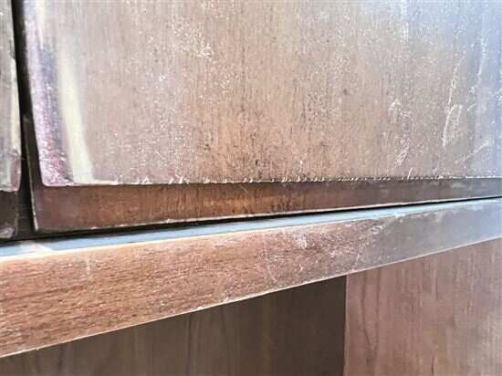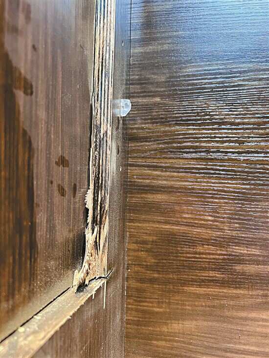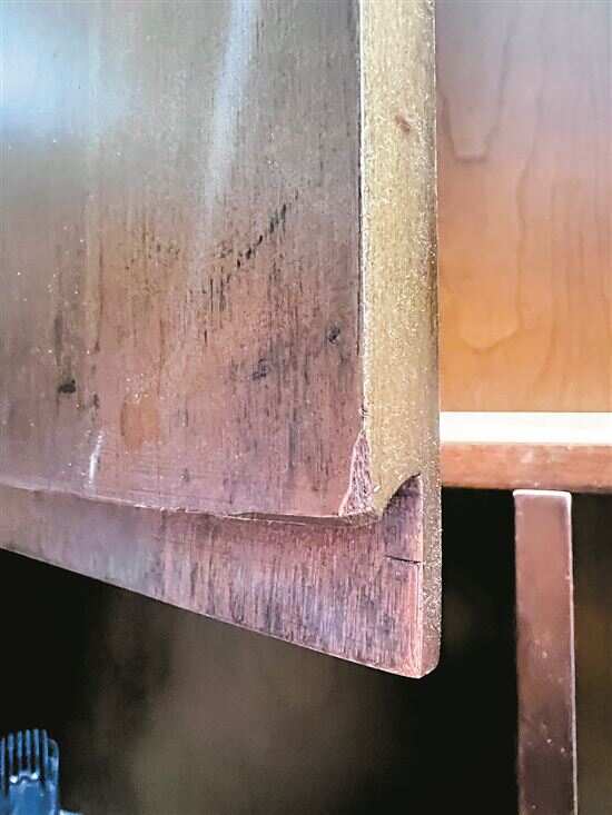 ■为鉴定而锯开的柜体木材,明显可见是夹板。 |