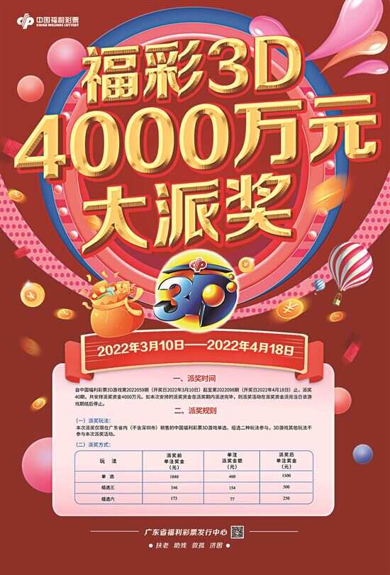 销售503万元,派出奖金84万元 新快报讯 记者陆妍思 通讯员莫冠婷 曹欣然报道 3月10日,广东福彩3D游戏4000万元大派奖活动正式启动,计划连续派奖40期,派奖总金额高达4000万元。活动不仅为喜爱3D游戏的老彩民带来福利与惊喜,也吸引了新彩民参与。 据统计,派奖首日(第22059期)销售额创今年全省3D历史销量新高,销售503万多元,环比(环比销量为派奖前十期平均销量)增长80.37%,共有3245注中奖彩票参与了派奖,共派出奖金84.4万多元。彩民朋友们购买3D的热情高涨,呈现出奖销两旺的好态势,为新一年广东彩市注入了新活力。 3D游戏派奖第一期(第22059期)使用派奖奖金84.4万元。本期返奖率(包含派奖奖金返奖)为71.53%。其中,“单选”玩法中奖注数1126注,使用派奖奖金517960元;“组选3”玩法中奖注数2119注,使用派奖奖金326326元;“组选6”玩法中奖注数0,使用派奖奖金0元。 本次活动总派奖奖金4000万元,分别对“单选”“组选3”和“组选6”玩法进行派奖。派奖期间,“单选”玩法在原每注中奖奖金1040元的基础上派奖460元,派奖后单注中奖奖金为1500元;“组选3”在原每注中奖奖金346元的基础上派奖154元,派奖后单注中奖奖金为500元;“组选6”在原每注中奖奖金173元的基础上派奖77元,派奖后单注中奖奖金为250元。
