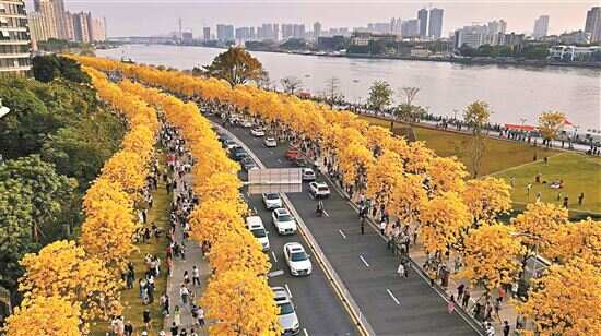 ■在广州海珠区南华西街洲咀路和环岛路段,道路两旁的黄花风铃木盛开,形成约500米黄灿灿的景观带,连日来吸引众多市民前来打卡。新快报记者 夏世焱/摄影报道