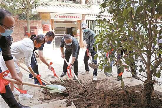 ■植树节当天,盐运西绿化公咨委委员和区政府工作人员一起在社区植树。 |