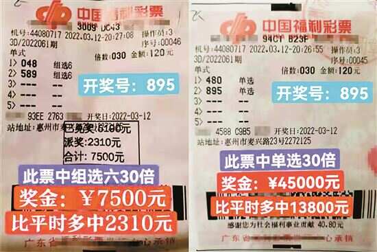 新快报讯 记者陆妍思 通讯员李娜报道 3月10日,广东福彩3D游戏4000万元大派奖活动火热开启。惠州彩民“虎力全开”,不仅参与度高,玩法更多样,投注倍数也增加了,派奖奖金自然也是喜滋滋地收入囊中。 派奖开启彩民踊跃参与 去年广东福彩3D游戏4000万元大派奖活动开启前,惠州福彩即通过网络平台、微信群及销售场所等多渠道进行了宣传预热。业主们反映,去年开展的省、市联动3D派奖活动非常火爆,彩友们意犹未尽,这次大家收到派奖活动消息后,已按捺不住激动的心情,第一时间参与到这场3D派奖盛宴。 据统计,3月10-15日,惠州市3D销售351万多元,3D“单选”共中出2374注,“组选3”共中出824注,“组选6”共中出5136注。 站点群里中奖喜讯不断 3月10日活动首日,仲恺44081144投注站点率先晒出了该站点3D包串“组选3”中12500元和包位单选中3000元的中奖彩票。11日、12日,该站点又分别售出包串和包位玩法15000、19500元、24250元和其他奖金不等的中奖票。 销售员高秋玲说:“彩民知道有大派奖活动,4000万的‘大福袋’大家都有机会争取,所以平时喜欢玩3D和很少玩3D的彩民参与热度都非常高。” 3月12日,市直属44080717投注站点分别售出两张3D各30倍的中奖票,其中一张为3D“单选”30倍,奖金45000元,该张中奖票共获得派奖金额13800元;另外一张为“组选6”30倍,中得总奖金7500元,包括派奖金额2310元。 “去年开展的3D派奖活动特别火,所以今年我站点提前营造起了派奖活动氛围,彩民们看到海报和朋友圈发的活动信息,都主动来了解活动详情。从活动前两天开始,购买3D的彩民就已明显增加了,活动开始后,彩民的投注倍数和玩法大大增加了。我想,这次彩民们会玩得更尽兴,因为派奖金额相比去年多了一倍呢!”44080717号站点业主赵雪梅介绍道。 惠城44080103投注站站主饶智聪特别喜欢研究游戏玩法,对这次的3D派奖活动他也非常乐意为彩民支招:“我们平时经常向彩民推荐一些简单玩法,彩民会容易理解些,能更好地体验到购彩乐趣。像这次有大派奖,我会更乐于向彩民推小复式玩法,如4码、5码、6码复式;定位复式玩法也不错,接下来我也会主推,让彩民有机会获得更多派奖奖金。” “虽然3D这款游戏只是小盘玩法,单注奖金不高,但这并不影响彩民对它的喜爱。其实3D游戏玩法挺多的,除了这次参与派奖活动的单选、组选3、组选6,还有包选、通选、和数,胆拖等共二十多种玩法,有兴趣的彩民可以多多了解一下。”