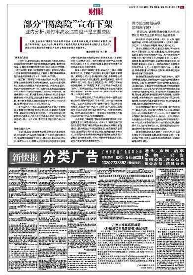 业内分析,赔付率高及监管趋严是主要原因 近期,业内称为“隔离险”的各种险种咨询、投保量持续走高,但新快报记者获悉,有些产品将停售。业内人士称,停售原因可能是疫情反复导致赔付率过高以及监管趋