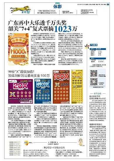 新快报讯 记者陆妍思报道 3月16日,体彩超级大乐透第22028期开奖,广东中出1注1000万元基本一等奖,后证实由韶关一张“7+4”复式票所中,单票总奖金达到1023万余元。 大乐透第