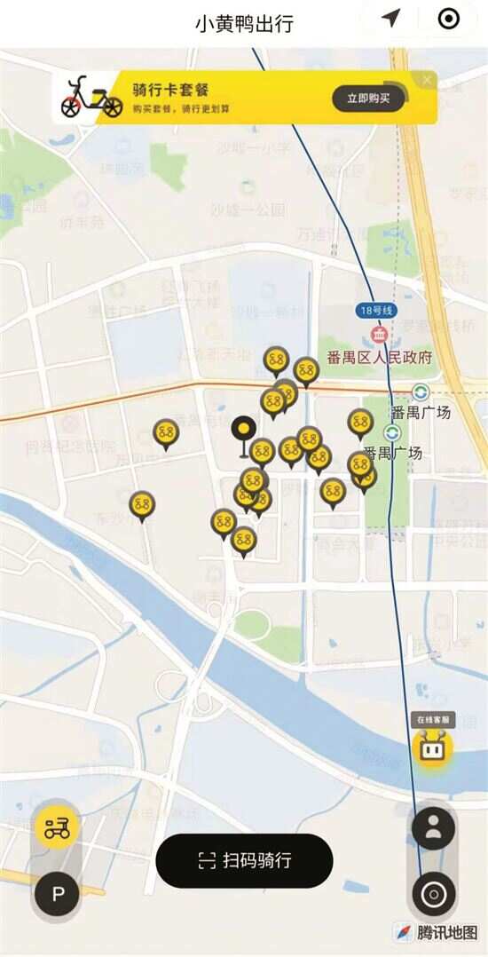 ■某品牌共享电动车小程序界面,显示运营区内有多台共享电动车可使用。 |