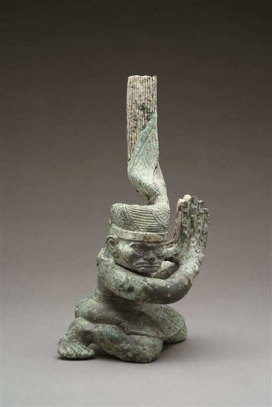 ■四川广汉市三星堆商代遗址四号坑出土扭头跪坐铜人像(资料图)。