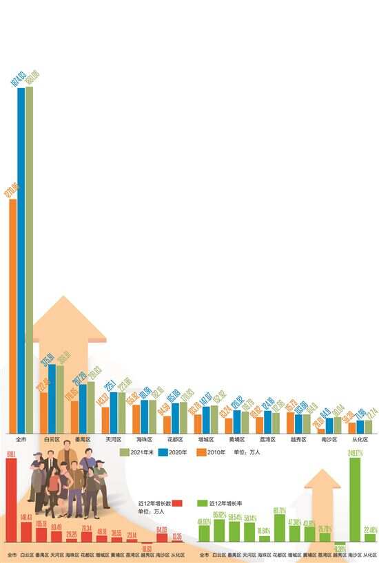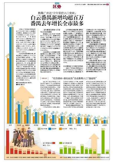 数看广州近12年常住人口变化: 3月初,广州市统计局网站发布了2021年广州市人口规模及分布情况。数据显示,2021年末广州市常住人口1881.06万人,而2020年末,广州拥有1874.03万人,也就是说,2021年广州的常住人口增加了7万人左右。此外,2021年末,户籍人口为1011.53万人,全年户籍自然增长人口为6.25万人。其中,户籍迁入人口为24.16万人,迁出人口为4.03万人,机械增长人口为20.13万人。 从各区的数据增减来看,番禺区常住人口增加14.57万人为全市各区最高,也是唯一一个新增常住人口超过十万的城区,增城、花都和南沙三个区新增数量也超过五万。另一方面,荔湾、黄埔、白云和天河四个城区常住人口较之上一年度则有所下降。新快报记者根据此前市统计局网站公布的《广州市2010-2020年常住人口及分布》数据统计发现,2010年至今,白云区和番禺区新增常住人口都超过百万,其中白云区更达到146万人,越秀区常住人口则减少10万人。 ■采写:新快报记者 李应华 ■制图:廖木兴 去年番禺区新增14万常住人口全市最高 数据显示,2021年末广州市常住人口1881.06万人,城镇化率为86.46%。年末户籍人口1011.53万人,城镇化率为80.81%;全年户籍出生人口11.80万人,出生率11.82‰;死亡人口5.55万人,死亡率5.56‰;自然增长人口6.25万人,自然增长率6.26‰。户籍迁入人口24.16万人,迁出人口4.03万人,机械增长人口20.13万人。 从各区常住人口及城镇化率数据来看,白云、番禺、天河三个区排名前三,白云区是目前唯一一个常住人口超300万的城区,该区在2015年后就达到这一门槛,目前有368.91万常住人口。番禺区有281.83万常住人口,排名全市第二,天河区则有223.86万,排名第四的海珠则已经低于200万的门槛。海珠、花都、增城、黄埔、荔湾和越秀六区都有超过百万常住人口,而南沙和从化则不足百万。 从年度增长数量来看,番禺区增加了14.57万常住人口为全市各区最高,也是唯一一个新增常住人口超过十万的城区,增城、花都和南沙三个区新增数量也超过五万。另外,荔湾、黄埔、白云和天河四个城区常住人口较之上一年度则有所下降,荔湾区下降最多,达11.2万,黄埔区和白云区常住人口也减少7万左右,天河区则减少1.24万。从增长率来看,南沙区由于人口基数较低,增长率达6.05%,为各区最高,番禺区也达到了5.45%。花都和增城的增长率在3%左右,越秀区和从化区增长率均在1%左右,海珠区为0.11%,常住人口下降的四区中,荔湾区下降幅度为9.02%、黄埔区为5.62%、白云区为1.86%、天河区为0.55%。 白云番禺近12年稳守前两位 此前,广州市统计局网站也公布了《广州市2010-2020年常住人口及分布》数据,加上最新数据,可以梳理出近12年广州各区常住人口数量变化。从排名来看,白云和番禺一直占据前两名的位置。天河则在2013年超越海珠从第四上升到第三。南沙超越从化上升一位,其余各区对比中,花都超过了增城、黄埔超过了荔湾,越秀区从一开始的第五一路下降到第九位。 从增长数量来看,白云番禺的增长数量均超过了百万,其中白云区常住人口增长近150万,可见两区近12年排名一直在广州前两位的底气。天河、花都和南沙增长数量也超过50万人,增城则为49万人左右,黄埔增长量为36万、海珠、荔湾则在20万至30万之间,从化区增长13万,越秀区则下降了10万左右。 从增长率来看,南沙区人口基数低也导致增长率达到246%,为全市最高,花都区的增长率也超过80%,增长量最大的白云区增长率达65%排名第三,番禺区为59%排名第四,天河区也增长率也超过50%,增城和黄埔增长率超过了40%。 专家分析 “经济增长+基础设施”造成番禺人口“强磁场” 2021年广州全市常住人口比2020年只增长了7万,如何看待这种变化?广东省体制改革研究会执行会长彭澎分析原因有四,一是经济去年四个季度都是下行,房地产、专业市场、会展、酒店、文旅等等行业都不景气;二是超大城市生活成本并没有降低很多;三是内地二线城市崛起,产业转移,导致人口输出地可以就地就业;四是乡村振兴让农村可以有发展机会。不过彭澎表示,这种人口流入的陡然下降到底会不会是一种趋势,可能还要看疫情结束后的情况。 广州去年有白云、黄埔、荔湾、天河四个区常住人口下降,而番禺区猛增14万,彭澎认为,番禺区经济增长排名全市前列,提供了更多就业岗位,同时该区基础设施改善,交通更加便利,如新化快速的贯通、南大干线的串通等等,使番禺与主城区半小时通达实现,这些硬件优势都成为番禺释放强大人口吸力的原因。此外,原来番禺就是广州第一个“睡城”,有具全国影响力的华南大盘,这些年把消费留住、把就业留住做得不错,尤其是万博商圈的兴起,对人口也都有一定吸引力。 新快报记者翻查资料发现,广州市在2019年《广州市国土空间总体规划(2018~2035年)》草案中提出,到2035年人口控制在2000万左右。去年底,广州市发改委发布《广州市人口发展及社会领域公共服务体系建设“十四五”规划(征求意见稿)》,提出预计到2025年人口就达到2100万。时隔两年广州对人口预期有所提高,彭澎认为,这种调整的依据也只能是基于近十年的增长情况,比如每年40万人左右。再者,就是对人口流动方向的判断。总的来说,京津冀、长三角、珠三角还是人口流入的主要方向。但是,川渝、中部的主要城市甚至西安等西部城市也展现了一定的吸引力,这可能分流人口流入方向。