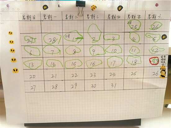 ■“小菜心”在日历上圈下爸爸妈妈的归期。 |