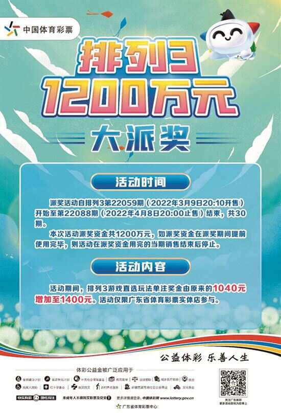 新快报讯 记者陆妍思报道 目前,广东体彩推出的排列3游戏1200万元大派奖活动正如火如荼进行中,截至3月22日,派奖活动已参与13期开奖,共已派奖405万元。值得一提的是,3月20日开奖的22069期,全省井喷中出直选2106注,当天共派出奖金约76万元。 据了解,本次派奖活动自排列3第22059期(2022年3月9日20:10开售)开始至第22088期(2022年4月8日20:00止售)结束,共30期。本次活动派奖资金共1200万元,如果派奖资金在派奖期间提前使用完毕,则活动在派奖资金用完的当期销售结束后停止。派奖期间,排列3游戏直选玩法单注奖金由原来的1040元增加至1400元。活动仅限广东省内体彩投注站参与。 排列3是体彩经典游戏,是指从000-999的数字中选取1个3位数作为一注投注号码进行的投注。每注金额人民币2元。按照不同的投注方式,它有直选投注、组选三、组选六等投注方式,奖金分别为1040元、346元、173元。此次派奖活动把直选投注奖金提升到1400元,让大家尽享新惊喜! 去年广东省也开展了同类活动,受到广大购彩者的热烈欢迎。广东体彩在感谢大家对公益事业支持的同时,也温馨提醒大家:为配合疫情防控和相关政策要求,派奖活动信息以官方动态发布信息为准,购彩者进店投注时也须注意做好防疫保护。此外,排列3游戏实行限号管理,请大家快乐投注,理性购彩。
