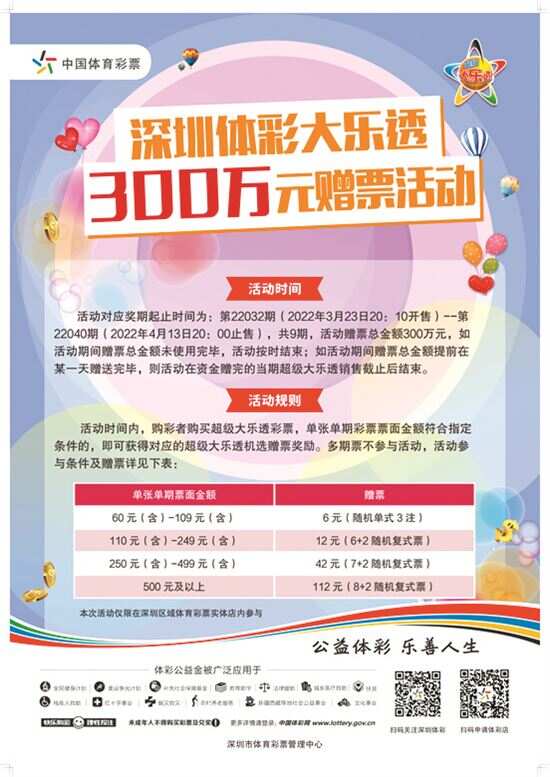 新快报讯 记者陆妍思报道 记者获悉,“深圳体彩大乐透赠票活动”已火热开启,将连送9期。 活动期间,购彩者在深圳区域内体彩实体店购买大乐透单张单期票面金额达到指定范围即可获赠相应金额的大乐透彩票。本次活动从大乐透第22032期(3月23日20:10开售)开始到第22040期(4月13日20:00止售)结束,预计派送9期,如活动期间赠票总金额提前赠送完毕,则活动在资金赠送完毕的当期大乐透销售截止后结束。需要注意的是,多期票不参与本次活动。 请广大购彩者严格遵守各级疫情防控要求,佩戴口罩进店购彩,购彩完毕后即时离店,不在店内逗留,不扎堆,不聚集。