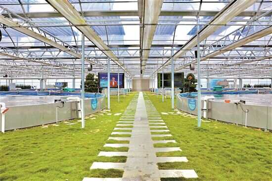 ■美丽渔村集约化养殖项目基地的温室大棚里,鱼池里养着加州鲈鱼、大号宝石斑等海鱼。 |