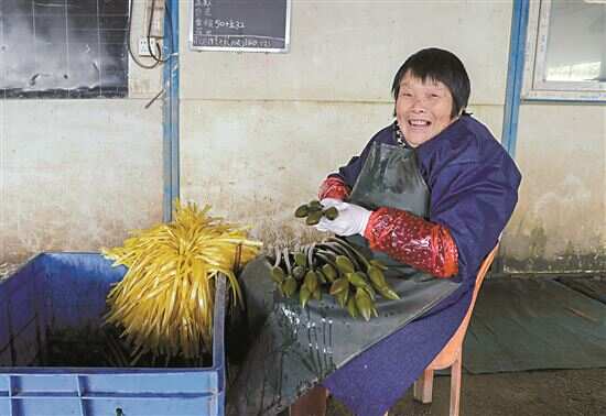 ■60多岁的村民钟阿姨在睡莲基地扎花。 |