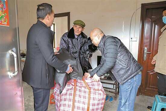 ■工作队队长梁志远(右一)把御寒物资送到村民手中。 |