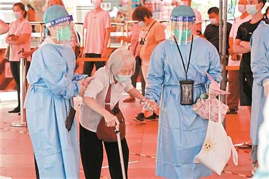 ■根据相关规定,黄码人员须完成“3天2检”,需要看病的可通过各大医院的网络医院进行。图为医护人员为黄码人员进行核酸检测后,搀扶行动不便的老人行走。 新快报记者 毕志毅/摄 |