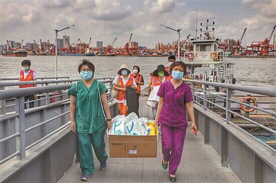 ■来自广州医科大学附属第五医院的医护人员提着防护服,和黄埔街道下沙社区的志愿者们,坐船踏上大吉沙岛给岛民做核酸检测。 |