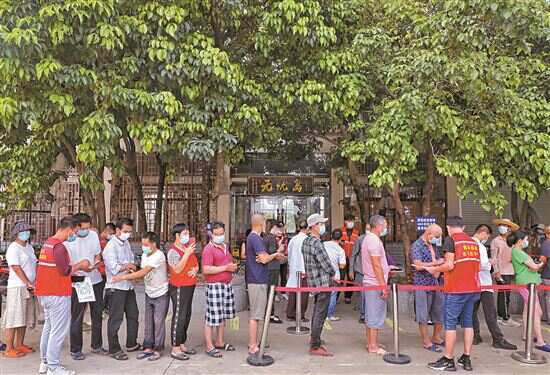 ■大吉沙岛的村民排队做核酸检测,下沙社区工作人员和志愿者们在一旁耐心指导手机扫码填写流程。 |
