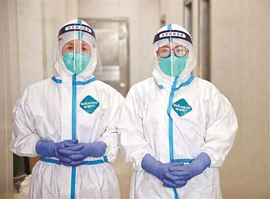 ■医护人员到达大吉沙岛后,换上防护装备。 左:广州医科大学附属第五医院工会副主席邬丽满 右:广州医科大学附属第五医院质评科副科长陈燕红 |