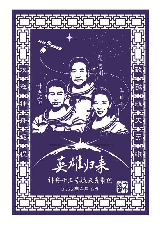 新快报讯 记者李超朝报道 4月16日,神舟十三号载人飞船返回舱在东风着陆场成功着陆,航天员翟志刚、王亚平、叶光富顺利安全出舱,飞行任务取得圆满成功。标志性着我国航天事业迈上新台阶。广州剪纸名家于中民创作三位航天员人物画像《英雄归来》,讴歌我国航天事业的成就。 于中民是河南人,1999年他南下广州,凭借出色的剪纸技艺在广州站稳脚跟。于中民埋头钻研剪纸艺术,创新性地结合南北方剪纸艺术,独创出荣派剪纸,结合南方剪纸的纤细灵巧与北方剪纸的淳朴狂放,令剪纸风格独具一格。