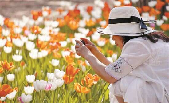 4月19日,游人在北臧村镇永定河畔的绿色港湾内拍摄盛开的郁金香。近日,不少游人来到北京市大兴区北臧村镇永定河畔的绿色港湾参加郁金香艺术文化节。新华社发