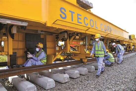 4月20日,工作人员在印度尼西亚万隆雅万高铁铺轨施工现场作业。