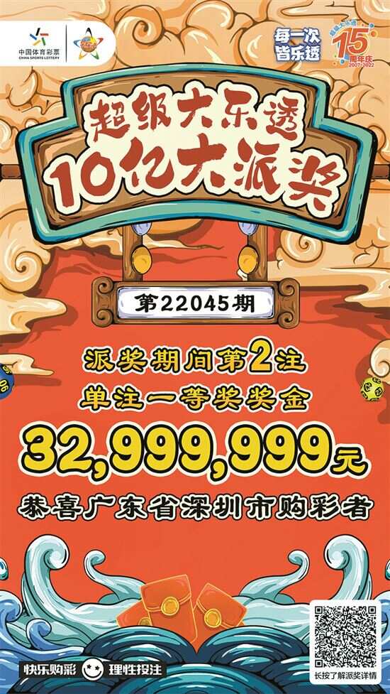 大乐透10亿派奖助力 新快报讯 记者陆妍思报道 深圳连续两期中得大乐透头奖,而且这次还是追加大奖!4月25日,超级大乐透第22045期开奖,同时也是超级大乐透10亿元大派奖第6期,当期全国仅中出1注一等奖,由广东省深圳市一位幸运儿独揽一等奖派奖奖金,总奖金达3299万多元。这也是大乐透10亿元派奖以来,广东中出的首注加料头奖。 深圳15元追加票独揽3299万 大乐透第22045期的中奖号码为:前区“02、03、07、12、20”;后区“01、05”。前区号码大小比1∶4,奇偶比2∶3,“02”连续3期开出,“20”为上期重号,开出一组连号“02、03”;后区开出双小双奇组合,其中“01”遗漏12期后开出。 当期全国仅中出1注一等奖,出自广东省深圳市赤湾四路前海丹华园10号商铺的4402038419体彩实体店,且该注一等奖中奖彩票是一张15元5注的追加单式票,符合派奖参与条件,获得奖金3299万多元。 据《关于开展2022年超级大乐透派奖活动的公告》,一等奖派奖每期1500万元,派奖奖金按中奖注数均分,基本投注和追加投注按游戏规则规定的比例分配。按照游戏规则,追加投注单注奖金为当期基本投注对应单注奖金的80%。本期仅有一注符合一等奖派奖条件,那么基本投注单注派奖奖金计算过程是15000000÷(1+0.8)=8333333.33元,按游戏规则按元取整后,奖金为833万多元;追加投注单注派奖奖金为6666666.66元,按元取整后,奖金为666万多元,相加后单注派奖奖金即为1499万多元,从而本期广东省深圳市购彩者喜中单注一等奖奖金3299万多元。 这注3299万多元一等奖,是超级大乐透10亿大派奖期间,第2注单注奖金超3000万元一等奖。上期大乐透全国中出4注一等奖,但仅有山东1注符合派奖条件,获得3299万多元大奖。该期深圳也中出1注一等奖,但早于没有追加,仅捧得1000万元基本奖金。 当期固定奖派奖1953万 当期二等奖开出103注,单注奖金为13.67万多元;其中53注采用追加投注,单注追加奖金10.93万多元,根据10亿元大派奖规则,本期共有50注二等奖符合参与条件还可获得派奖奖金,每注多得二等奖派奖奖金9.99万多元,分享派奖奖金后,二等奖单注总奖金为34.61万多元。 当期三至九等奖等固定奖级中,符合参与条件的彩票,同时中得派奖奖金,单注派奖奖金为当期对应奖级单注奖金的50%,合共派送奖金1953万多元。 下期一等奖派奖1500万 当期全国销量为3.22亿元,为国家筹集彩票公益金1.16亿元。开奖后,奖池金额为11.84亿元,按照超级大乐透10亿元大派奖规则,当期1500万元一等奖派奖金额全部派送完毕,下期一等奖将继续派送1500万元;当期500万元二等奖派奖金额全部派送完毕,下期将继续派送500万元;当期开奖后,固定奖派奖余额为4.38亿元。 需要注意的是,只要进行追加投注且单张购彩金额15元及以上即可参与本次派奖活动,多期票在派奖期间按期参与(追加投注且单期购彩金额15元及以上)。截至目前,超级大乐透10亿元派奖活动一等奖已派送奖金9000万元,二等奖已派送奖金3000万元,固定奖已派送奖金1.21亿多元,合计派送奖金达2.41亿多元。
