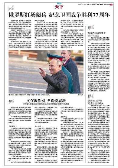 据新华社电 俄罗斯9日在莫斯科红场举行阅兵式,纪念卫国战争胜利77周年。俄罗斯总统普京在阅兵式上发表讲话,表示在祖国命运面临抉择之时,保护祖国永远是神圣的。 阅兵式于当地时间上午10时(北