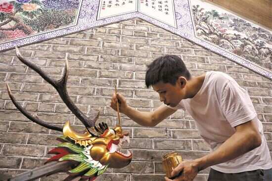 ■在广州黄埔区下沙村的古祠堂内,龙头师傅张伟潮正在为他制作的龙舟龙头上色。他的作品曾出现在北京冬奥会开幕式的倒计时视频中。新快报记者 李小萌/摄