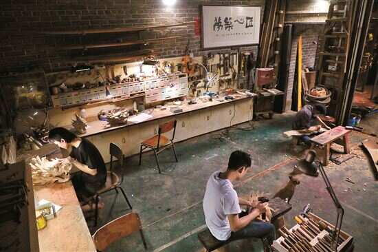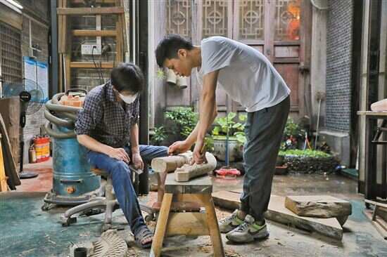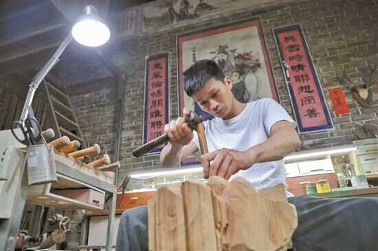 ■张伟潮教徒弟制作龙尾。庭院里,凿子、锉子、刻刀等数百种木刻工具琳琅满目,地上散落的樟木碎屑散发阵阵清香。 |