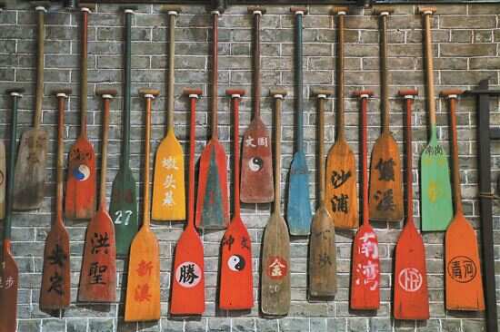 ■工作室的墙壁上摆满了张伟潮收集的龙舟船桨。 |