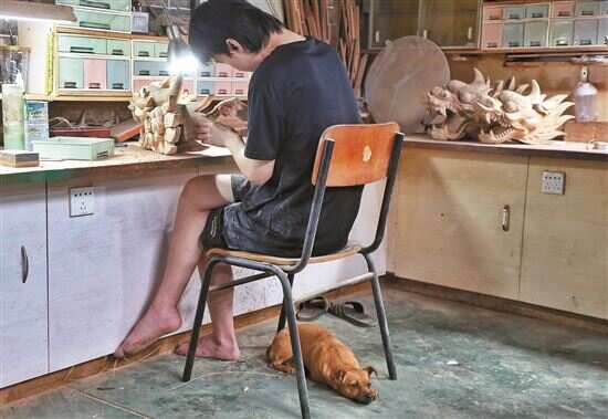 ■徒弟正细心打磨龙头,这是最简单也最需要耐性的环节。狗狗乖乖地趴在地上陪伴。 |